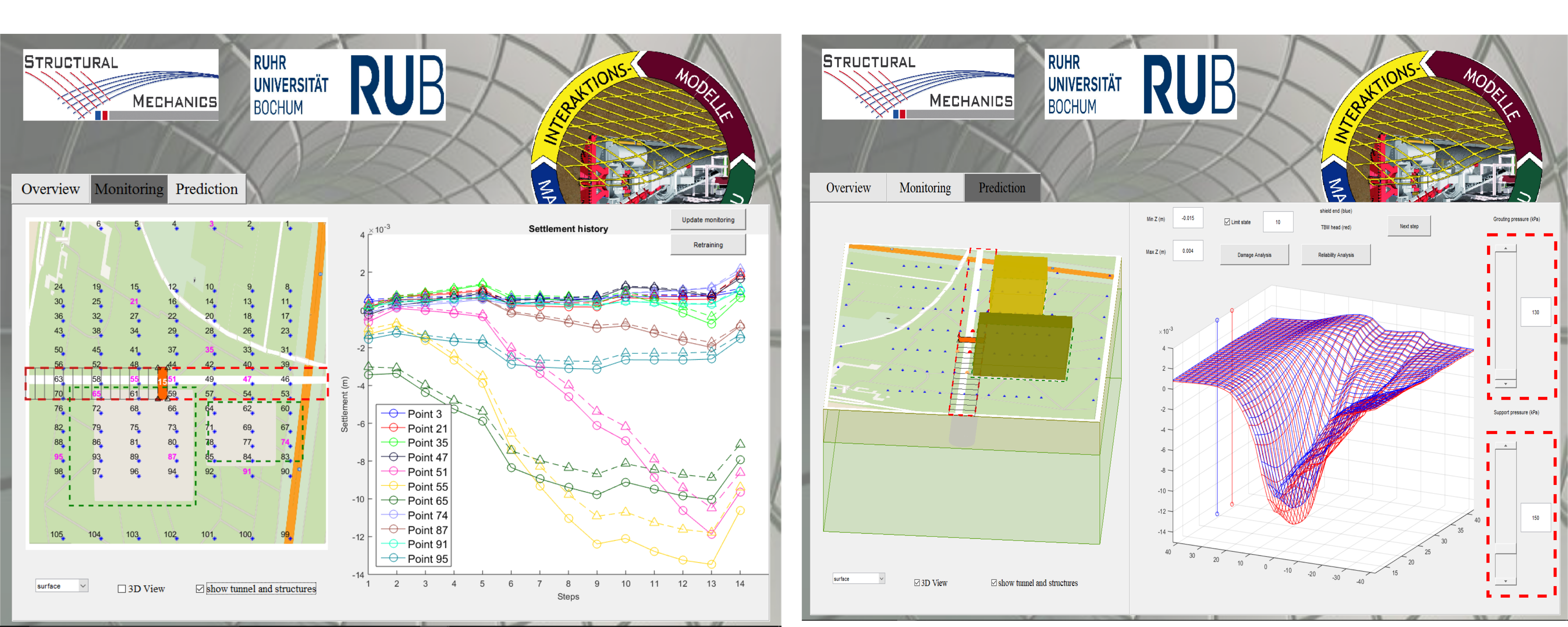 Within the university alliance UA Ruhr, the Institute for Structural Mechanics at Ruhr University Bochum is cooperating with the Institute for Artificial Intelligence at TU Dortmund within the research project “Fusion of Machine Learning and Numerical Simulation for Real-Time Steering in Mechanized Tunneling” The project is funded by the Mercator Research Center Ruhr (MERCUR). The objective is to link simulation and monitoring based approaches for real-time predictions of mechanized tunneling processes with machine learning methods. The physics of the underlying processes obtained by simulation models are fused with knowledge gained from real-time data analyses of monitoring and sensor data to improve the process steering in mechanized tunneling.
