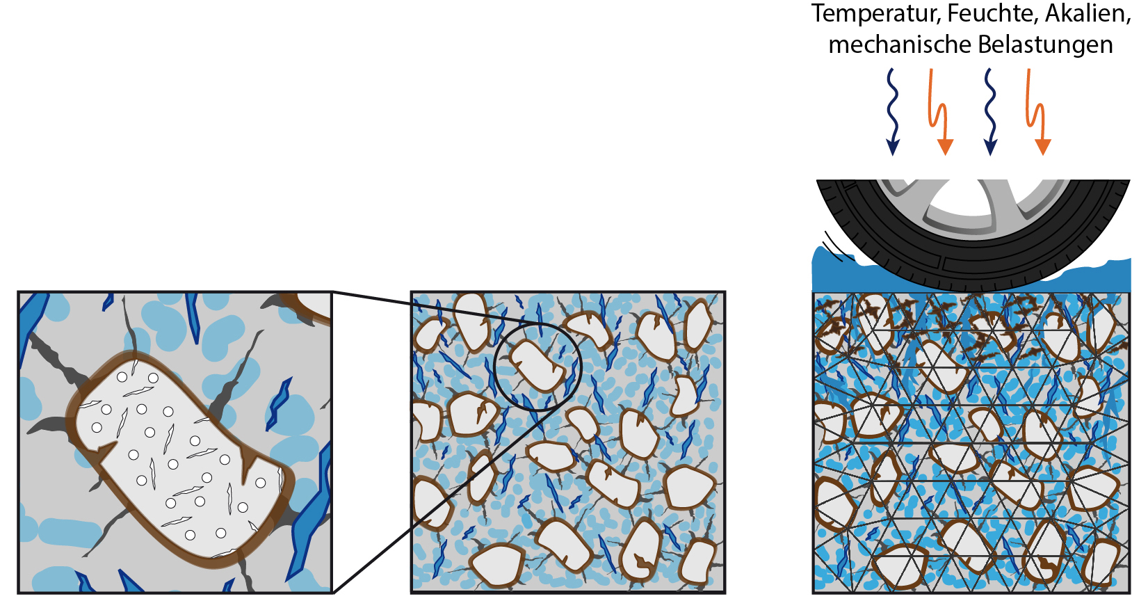 Through their research, this project group led by Prof. Gehlen (Technical University of Munich) aims to establish a model-based characterization of the degradation of concrete on multiple scales and enable a classification of the degree of damage based on simulated and measured coda data. The role of the institute of Structural Mechanics within this Research Unit is the characterization of the influence of the changes in the structure (microscale and macroscale) of concrete subject to various loading scenarios and the application of novel pattern recognition algorithms for the identification and classification of CODA signals.