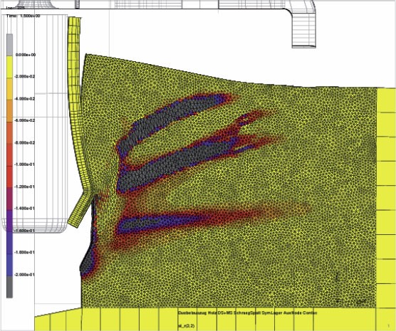 The prediction of potential failure mechanisms in the subsurface and the damage of subsurface infrastructure is essential for a reliable and sustainable utilization of the subsurface. Within the project “Subsurface Modeling and Engineering: Robust Numerical Simulation of Failure Processes in Geomaterials”, which was funded by the Mercator Research Center Ruhr (MERCUR), numerical models for initiation and evolution of failure zones in geomaterials have been developed based on comprehensive preliminary work. The developed models enable robust and reliable large scale 3D analyses of complex crack and shear band configurations. The project was one of the key topics of the later founded RUB Research Department “Subsurface Modeling and Engineering“.