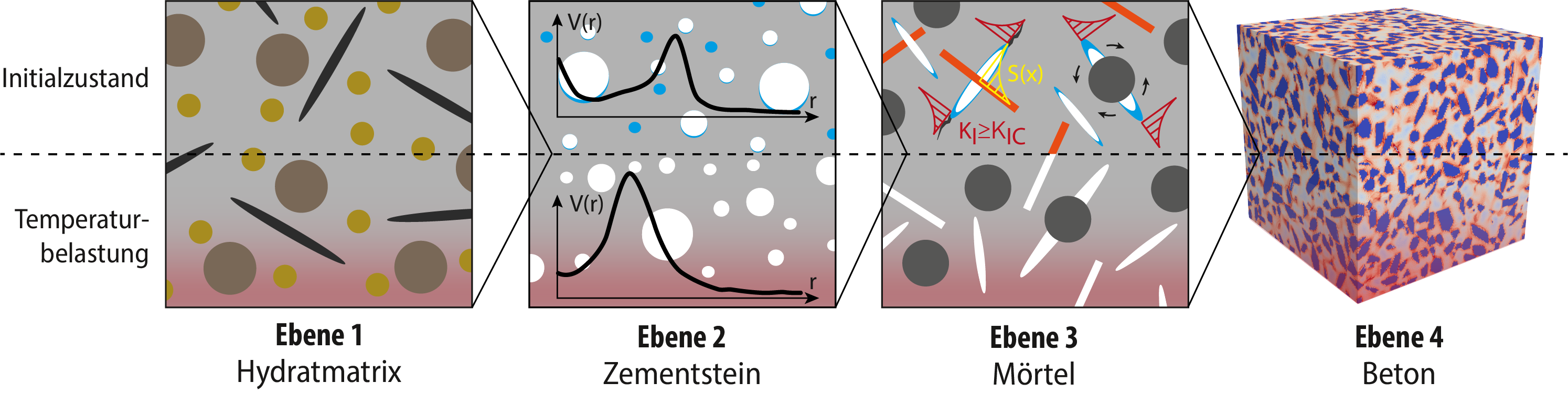 The aim of the research project is to gain insights into the interaction of binder-specific dehydration mechanisms of hardened cement paste, the microcrack network that forms and its changes during the fire exposure of concrete, and the resulting thermo-hydraulic transport processes. For this purpose, a combination of multiphysical models is developed to predict the chemo-hydro-thermo-mechanical behavior of the examined blended concretes, with sub-models characterizing the damage and transport processes at several spatial scales.