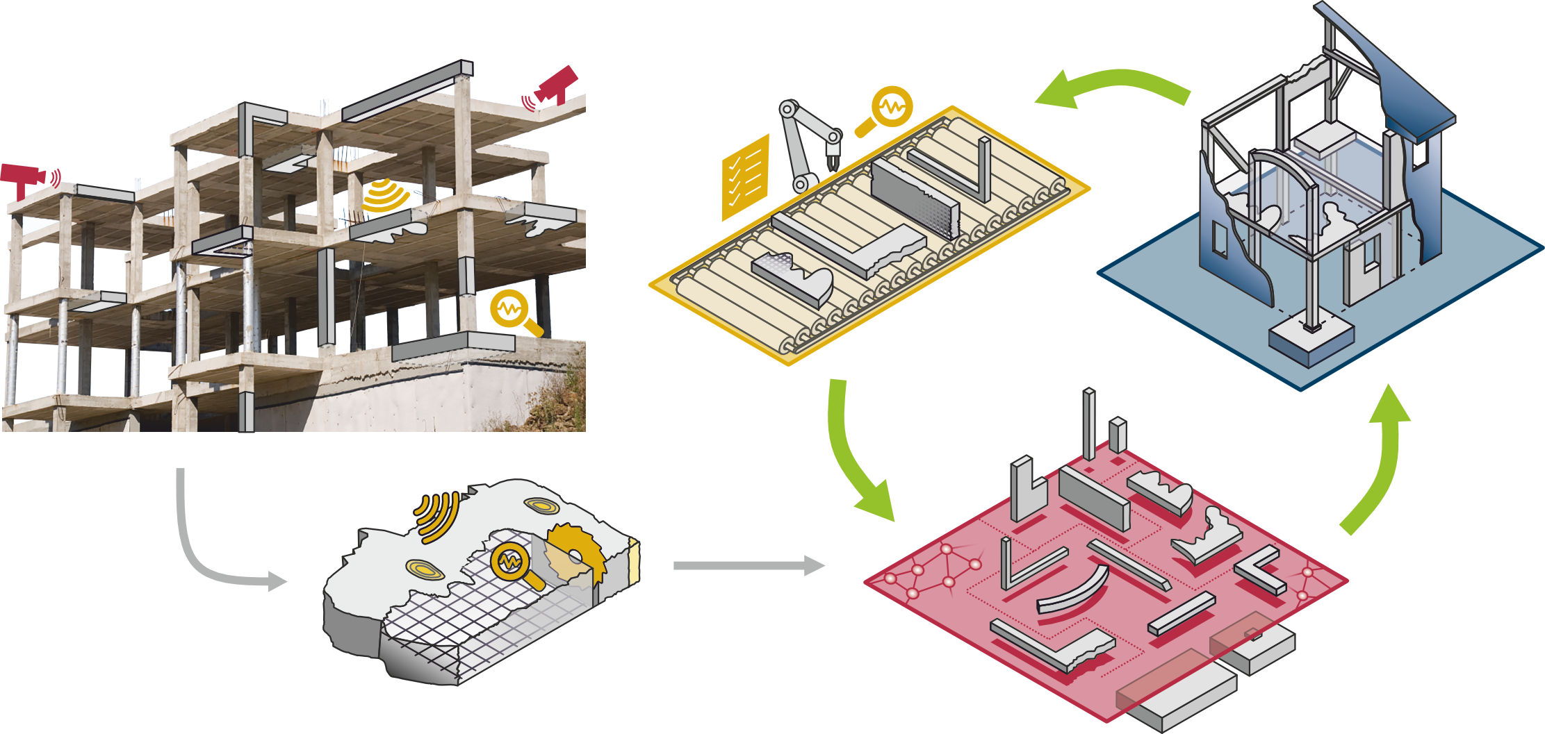 Instead of recycling old concrete, researchers of the SFB 1683 will investigate existing concrete elements, e.g. ceilings, walls, supports and foundations, regarding their quality, reusability and adaptability. All these information will be gathered to build a modular construction kit, which in turn will give the base to build up a building from recently produced and adapted old structures. This innovative concept aims to reduce greenhouse gas emissions and curb the accumulation of unmanageable masses of construction waste.