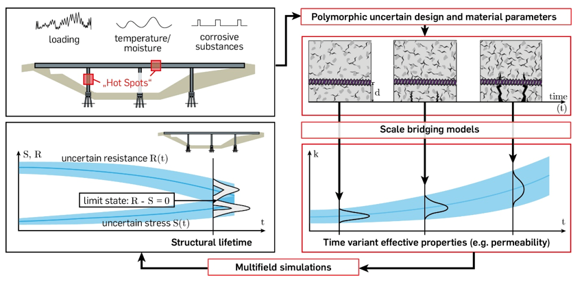 The objective of subproject 6 “Optimization Approaches for Robust and Durable Reinforced Concrete and Fibre Concrete Structures under Consideration of Scale Bridging Polymorphic Uncertainty Modelling“ of the DFG-Priority Program SPP 1886 is the development of computational reliability and optimization methods for the lifetime oriented design of reinforced and steel fibre concrete structures, which allow to follow the influence of uncertain, i.e. non-deterministic describable design parameters and uncertain time variant structural actions on the structural state throughout its life. Thereby, interactions between loading induced damage and environmentally induced deterioration processes are considered by multiscale models in conjunction with physically sound durability models. The structural reliability is computed by multifield simulations under consideration of polymorphic uncertain data (stochastic parameters, intervals and fuzzy numbers as well as generalized uncertainty models).